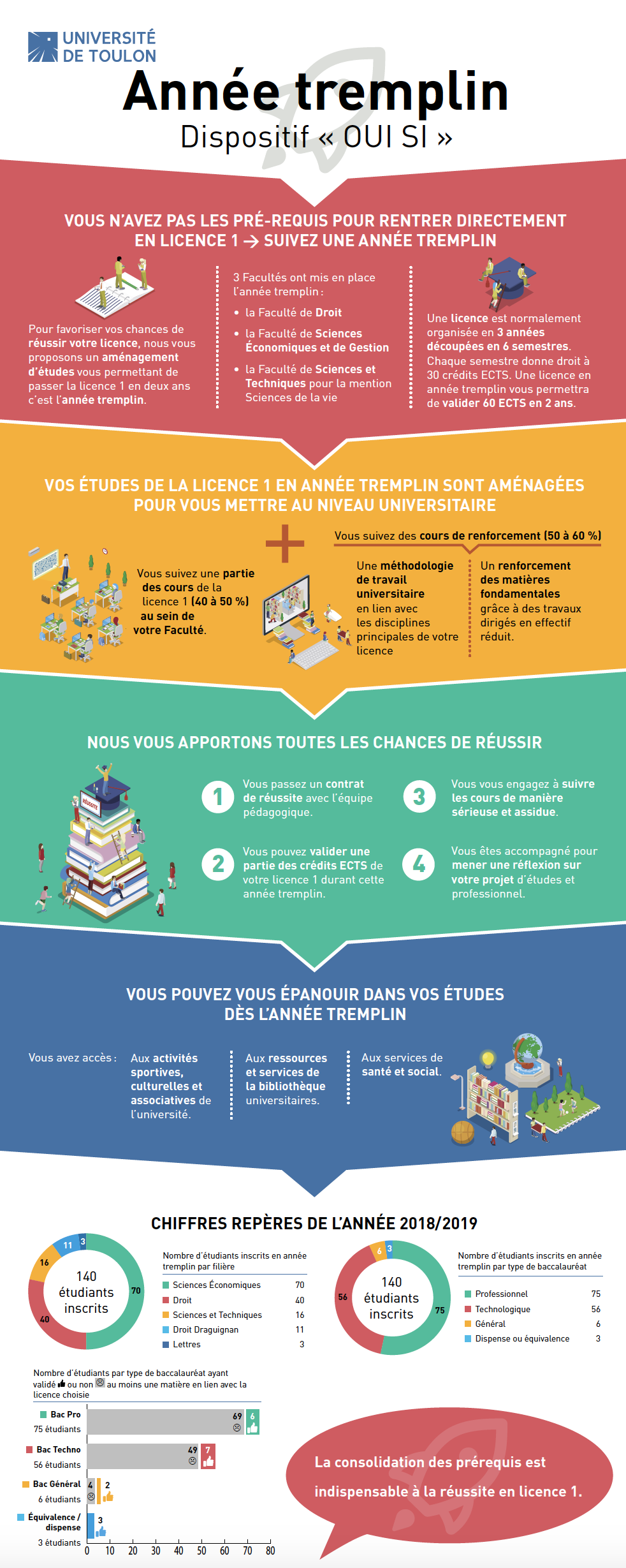 Dans le cadre de la mise en place de la loi ORE, visant à améliorer la réussite des étudiants en premier cycle universitaire, l’Université de Toulon propose une année Tremplin aux étudiants qui ne satisfont pas les attendus de la mention de la licence choisie (dispositif « oui si »).