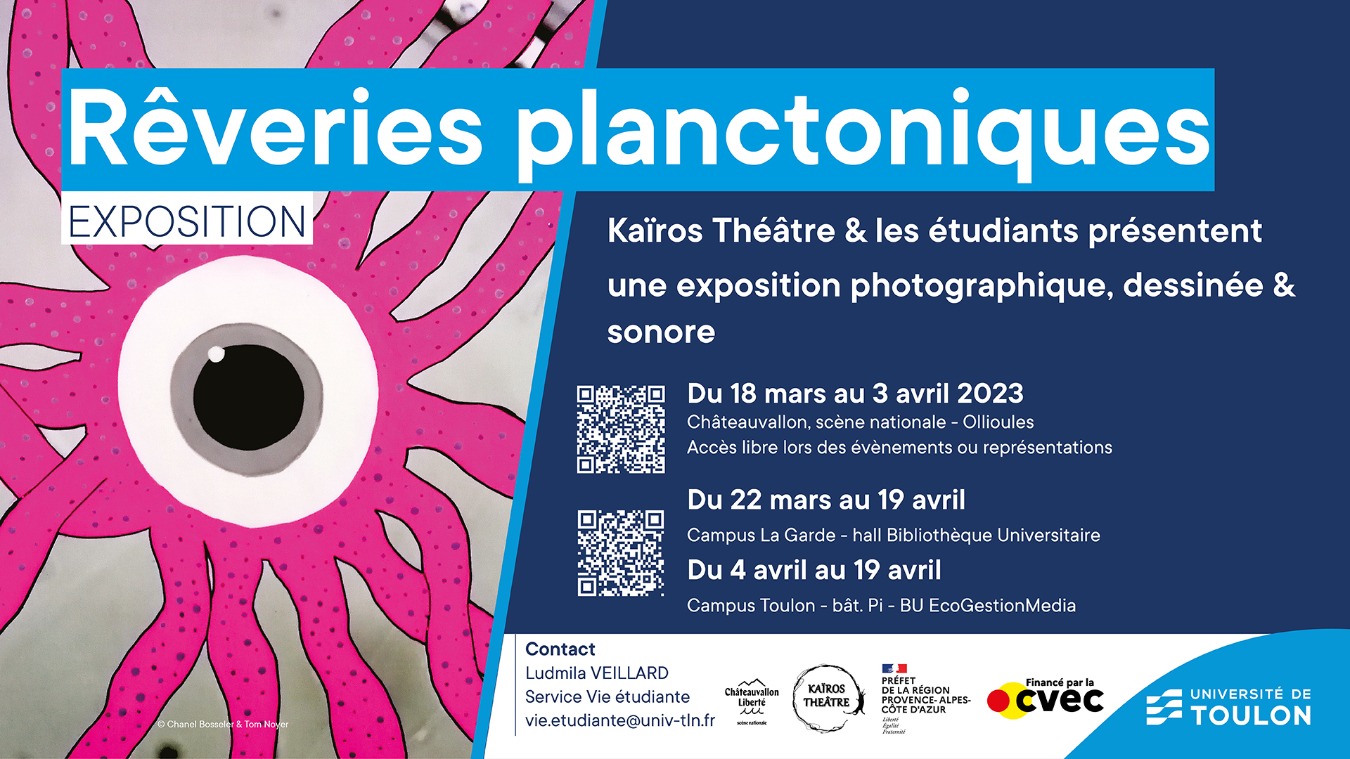 Le public pourra également découvrir l’exposition Rêveries planctoniques le soir de la représentation avant qu’elle ne vienne orner les murs des bibliothèques universitaires et ceux de Châteauvallon – Scène nationale dans le cadre du thema « passion bleue ». Les œuvres sont des réinterprétations libres des étudiants inscrits à l’atelier dessin de photos de zooplanctons et de phytoplanctons fournis par des biologistes marins de l’UTLN, Dominique et Jean-Louis Jamet.