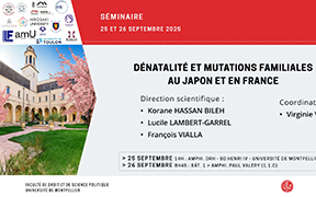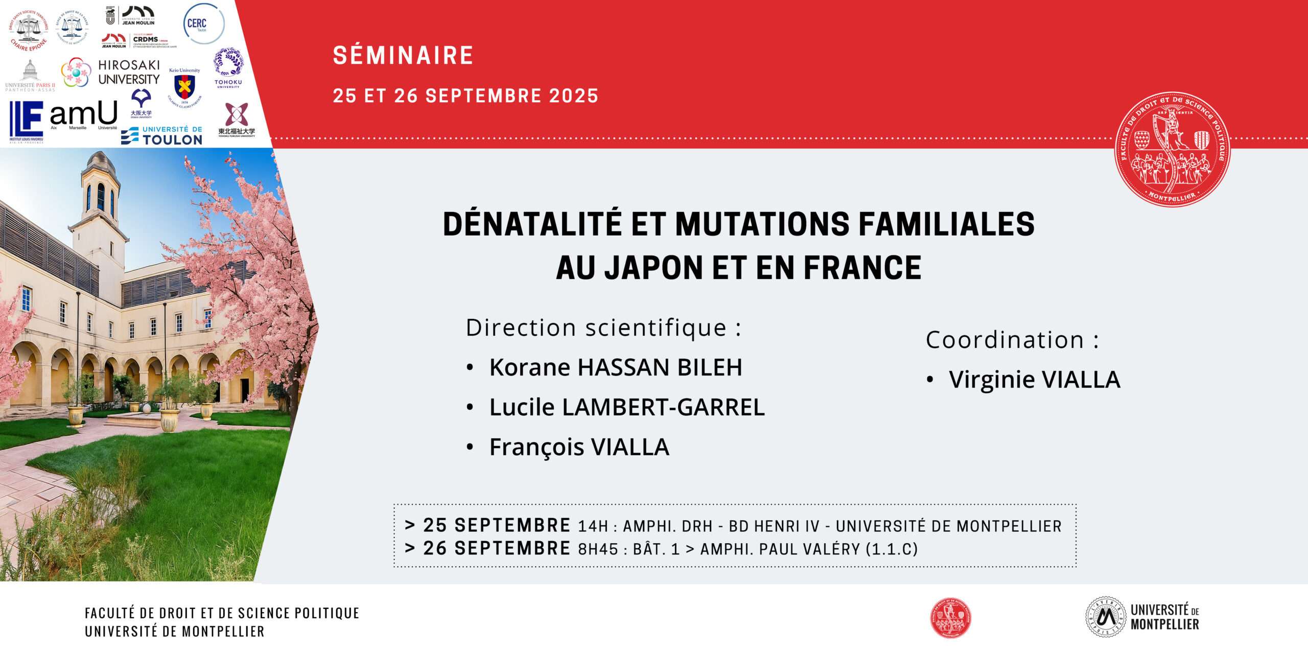 Le colloque franco japonais sur la dénatalité et les mutations familiales aura lieu les 25 et 26 septembre 2025 en présence de chercheurs universitaires de Montpellier, Paris 1 Sorbonne, Lyon, Aix et Toulon et de chercheurs universitaires japonais de Tokyo, Kyoto, Tohoku, Hirosaki et Keio.