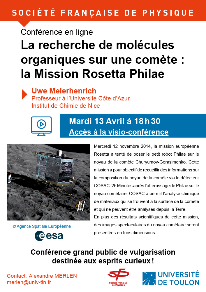Conférence : La recherche de molécules organiques sur une comète : la Mission Rosetta Philae
