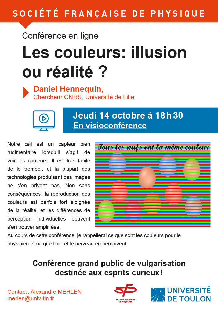 Au cours de cette conférence, je rappellerai ce que sont les couleurs pour le physicien et ce que l’œil et le cerveau en perçoivent. Nous constaterons, par exemple, que si l’œil était aussi performant pour les couleurs que l’oreille l’est pour distinguer les notes, nous pourrions d’un seul coup d’œil connaître la composition chimique de ce que nous regardons. Nous examinerons aussi les différentes techniques de reproduction des couleurs, et leurs limites.