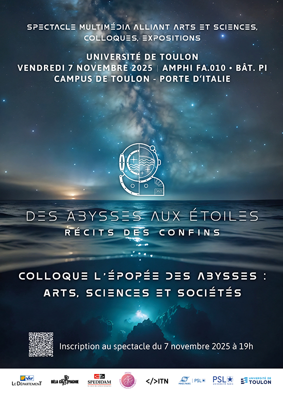 Présentée à Toulon les 6 et 7 novembre, la partie Abysses bénéficie du soutien actif de l’Université de Toulon, de l’ESADTPM, de l’Ifremer et du Département du Var. Cette collaboration illustre la richesse des échanges entre établissements scientifiques et artistiques, au service d’une même ambition : rendre visible et sensible la recherche.