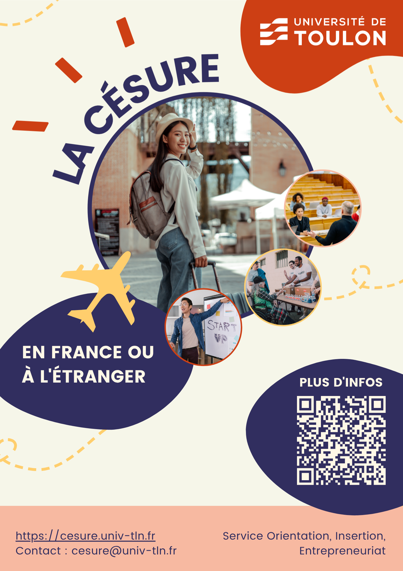 Vous pouvez faire une césure à l’étranger. Contactez la Direction des Relations Internationales par mail à international univ-tln.fr de l’université pour en savoir plus les bourses mobilité, les conseils au départ et l’enregistrement obligatoire sur la plateforme Moov’on.