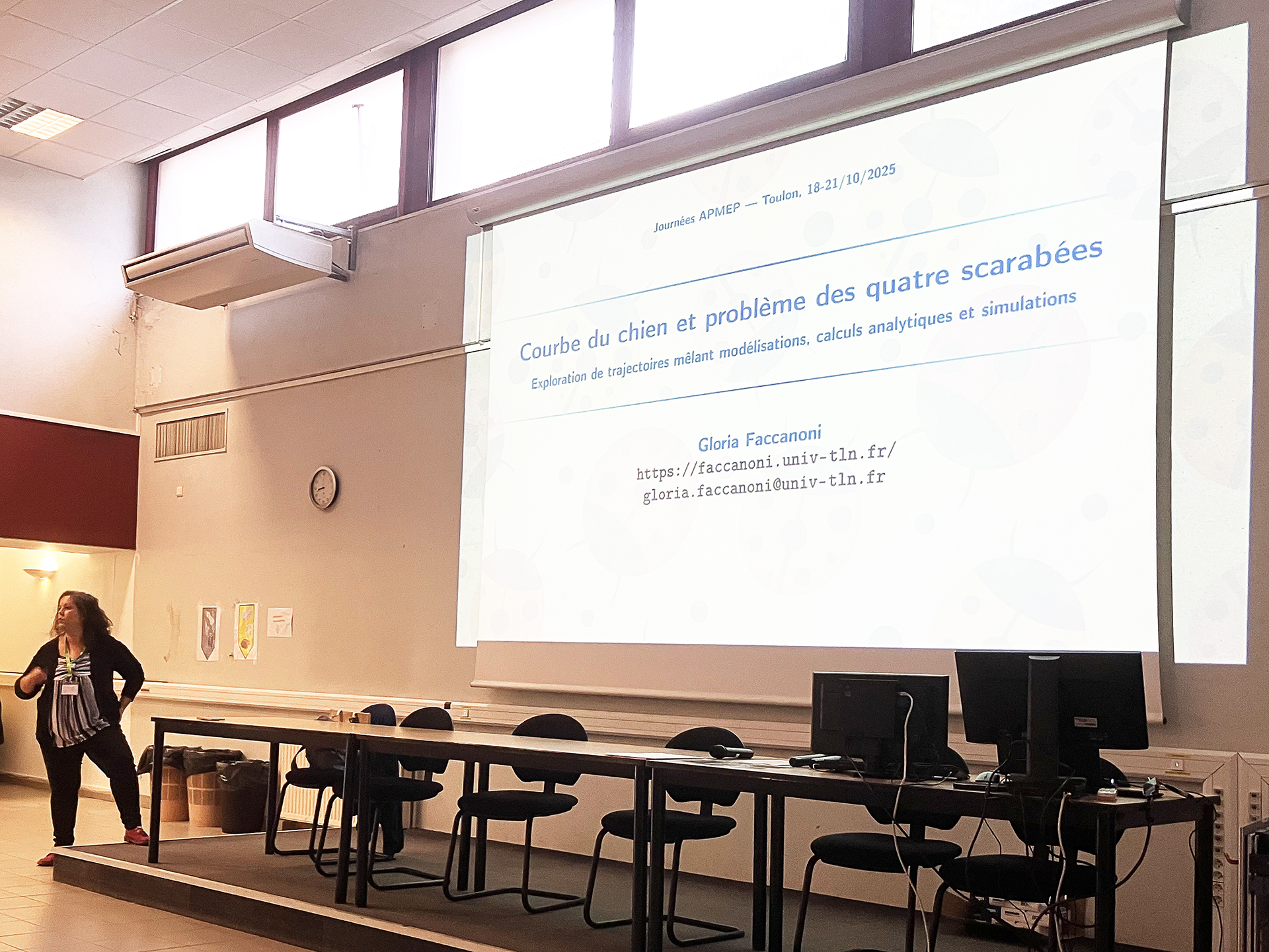 Gloria Faccanoni, enseignante-chercheuse à l’IMATH, a animé une conférence intitulée « Courbe du chien et le problème des quatre scarabées », proposant une exploration fascinante de trajectoires mêlant modélisations mathématiques, calculs analytiques et simulations numériques.