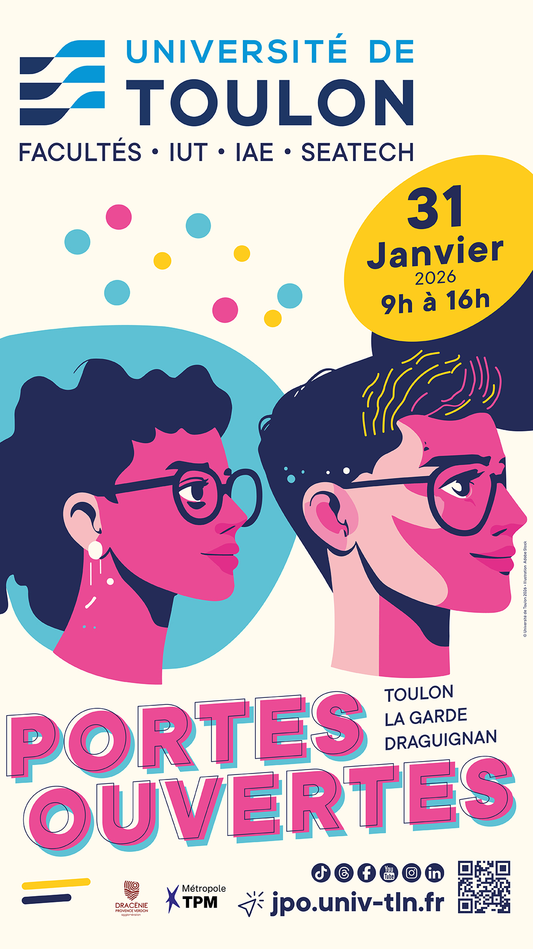 Les jeunes varois et leurs familles sont invités à venir rencontrer les enseignants, étudiants et personnels de l’Université de Toulon : Facultés, IUT, IAE et SeaTech lors de la Journée Portes Ouvertes (JPO) du samedi 31 janvier 2026 de 9h à 16h sur les campus de La Garde, Toulon et Draguignan (IUT et Faculté de droit).