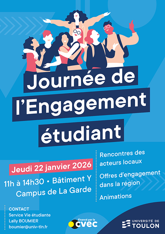 Dans le cadre de la valorisation et de la promotion de l’engagement étudiant, le service Vie étudiante et de campus organise sur le campus une Journée de l’engagement le 22 janvier 2026, de 11h à 14h30, dans la hall du bâtiment Y et dans la salle Y.013a.