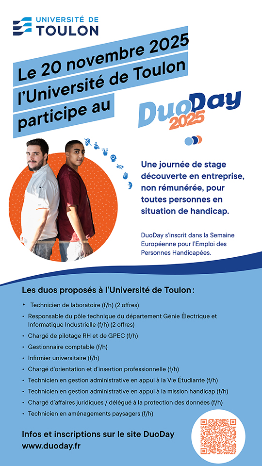 Le jeudi 20 novembre 2025, l’Université de Toulon participera pour la deuxième année consécutive, au DuoDay, un événement national qui vise à favoriser l’insertion des personnes en situation de handicap.