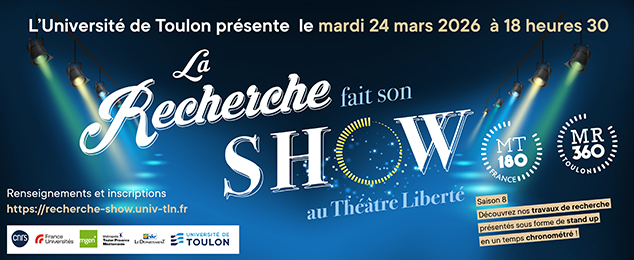 Vous vous demandez sur quoi travaillent nos chercheurs dans les laboratoires de l’Université de Toulon et vous avez un intérêt pour toute forme de science : venez assister à cette saison 8 de « La Recherche fait son show au théâtre Liberté » !