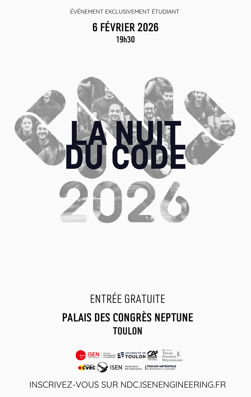 La Nuit du Code by ISEN x UTLN est un hackathon étudiant 100 % gratuit, dédié au développement web, à l’innovation et à la collaboration. Le temps d’une nuit, des étudiant·e·s de toute la métropole toulonnaise se réunissent en équipes pour concevoir un projet concret autour d’un thème révélé le jour même par une entreprise partenaire.