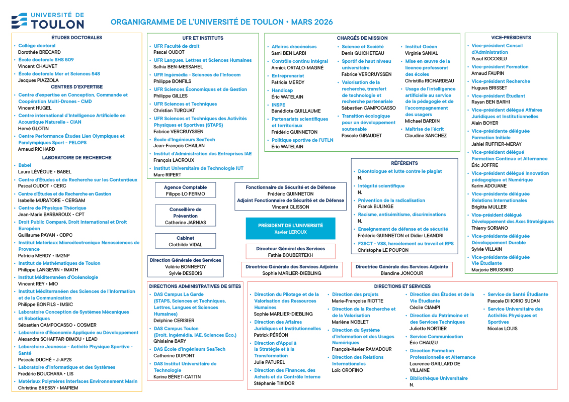 Organigramme de l’Université de Toulon Retrouvez l’organigramme général de l’Université de Toulon détaillé en cliquant ci-dessous : TÉLÉCHARGER : Organigramme de l’Université - 7 janvier 2026 (PDF – 545.7 kio)