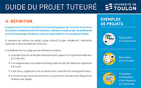 Le projet tuteuré est une modalité de travail pédagogique qui consiste en une mise en situation professionnelle de l’étudiant, réalisée en mode projet, de préférence au sein d’un groupe d’étudiants, sous la responsabilité d’un enseignant tuteur.