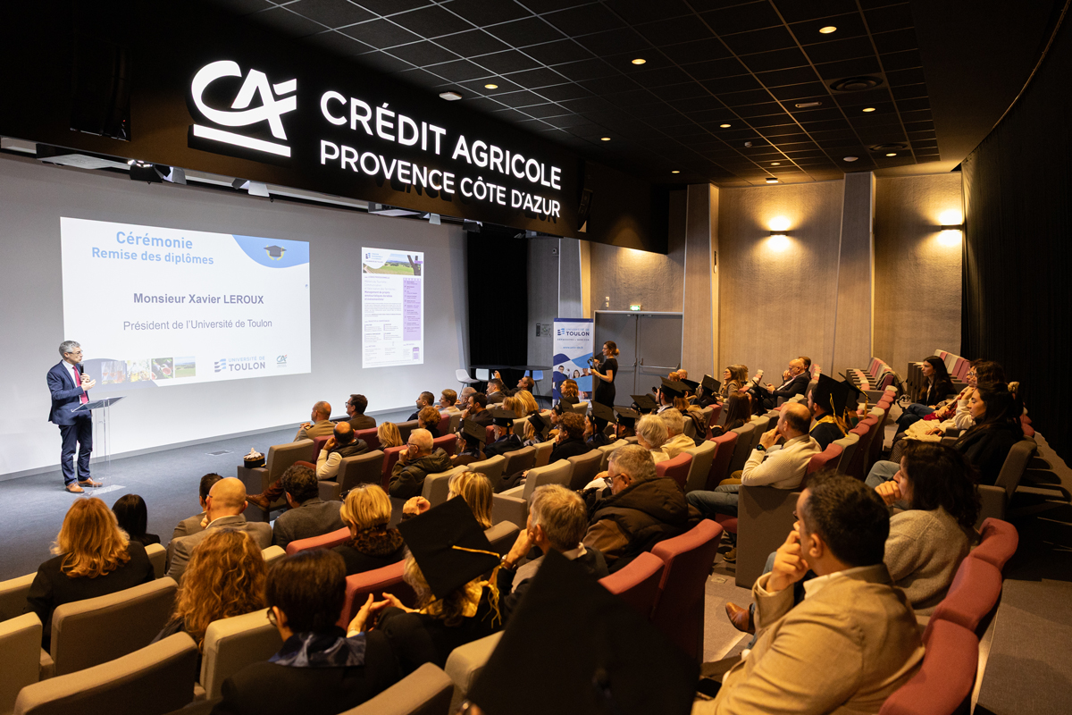 Le 5 février dernier, le siège du Crédit Agricole Provence Côte d’Azur à Draguignan a accueilli la cérémonie de remise des diplômes de la licence professionnelle Management de projets œnotouristiques durables et événementiels et du Diplôme d’Université Développer l’œnotourisme dans un cadre de développement durable. Deux diplômes portés par l’Université de Toulon et construits en partenariat étroit avec les acteurs du territoire.