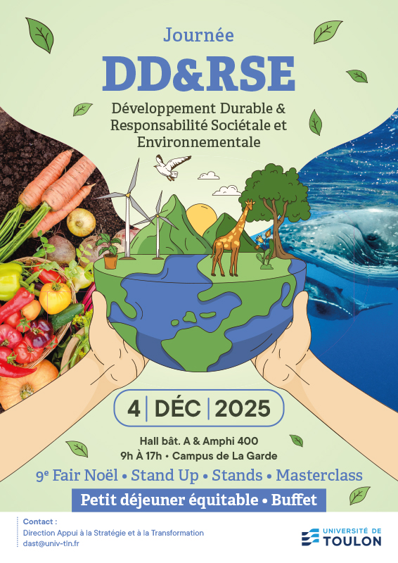 Organisé en partenariat avec le master CIED de l’UFR Sciences Économiques, cet événement fait suite au succès des Rencontres DD&RSE de l’an passé et s’inscrit pleinement dans la dynamique engagée par l’Université de Toulon en matière de transition écologique et sociétale.