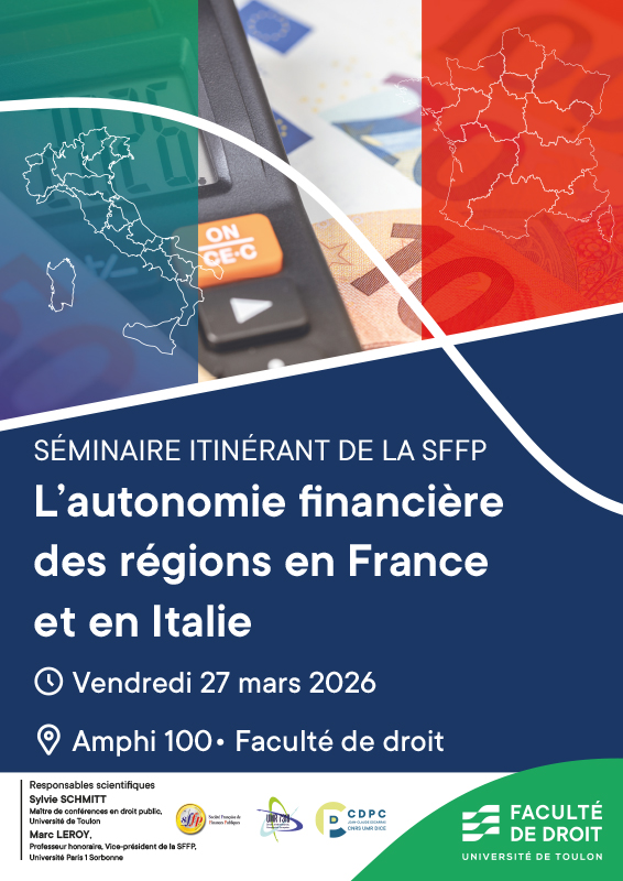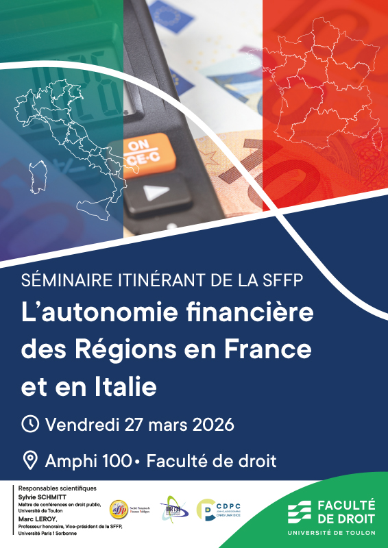 Le séminaire itinérant de la Société Française de Finances Publiques (SFFP), prévu le 27 mars 2026 à l’Université de Toulon, propose une analyse comparative approfondie de l’autonomie financière des collectivités régionales françaises et italiennes. Il réunit des spécialistes des finances publiques des deux pays. Outre son apport à la connaissance des pouvoirs régionaux, l’intérêt de cette comparaison est de confronter les réponses apportées par les réformes constitutionnelles de 2001 en Italie et de 2003 en France qui s’inscrivent dans un cadre institutionnel différent, l’État français décentralisé et l’État italien régionalisé.