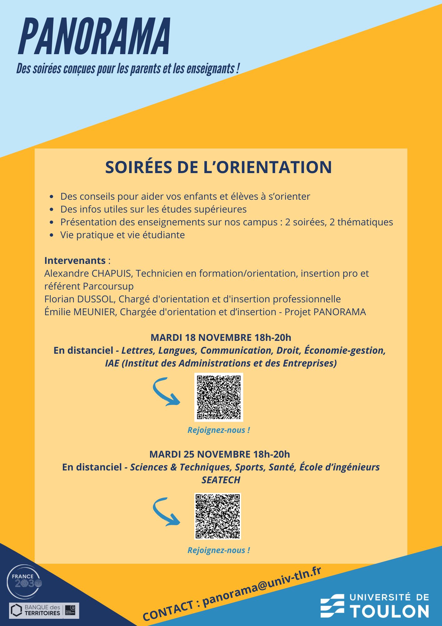 Le dispositif PANORAMA, dont l’objectif est d’accompagner les lycéens, leurs parents et les équipes éducatives dans la transition entre le secondaire et l’enseignement supérieur, vous propose pour la seconde édition des : SOIRÉES DE L’ORIENTATION